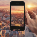 Ein futuristischer Geschäftsmann steht auf einem schwebenden Balkon in einer hochmodernen Stadt bei Sonnenuntergang. Er trägt einen eleganten, silbernen Anzug mit holografischen Akzenten und hält ein futuristisches iPhone mit transparentem Display in der Hand. Im Hintergrund sind fliegende Autos, Neonlichter ...